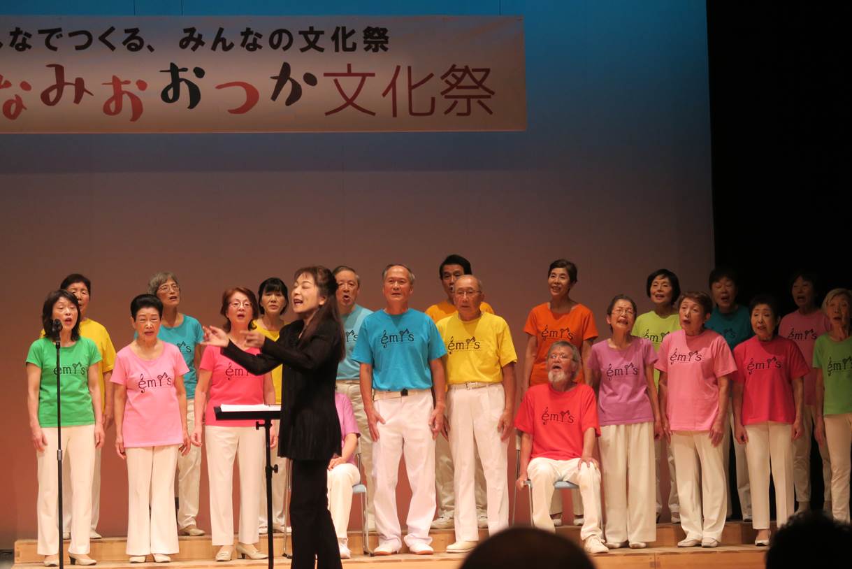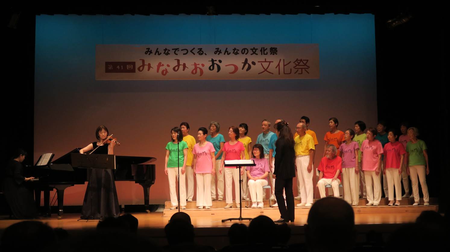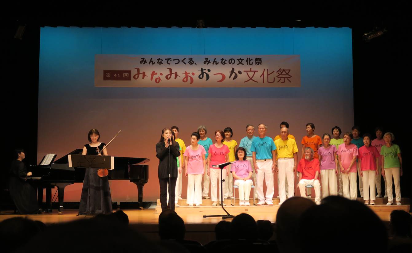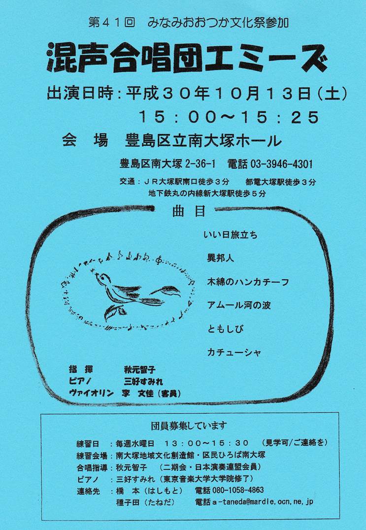 第41回みなみおおつか文化祭 混声合唱団 エミーズ 舞台発表 (2018.10.13 豊島区立 南大塚ホールにて) 指揮:秋元智子 ピアノ:三好すみれ ヴァイオリン:李文佳 演奏曲目 いい日旅立ち 異邦人 木綿のハンカチーフ アムール河の波 ともしび カチューシャ